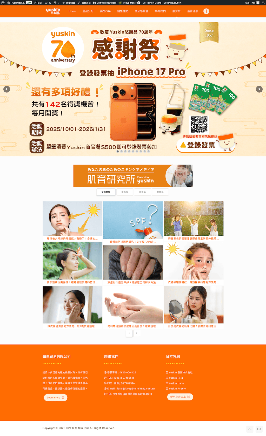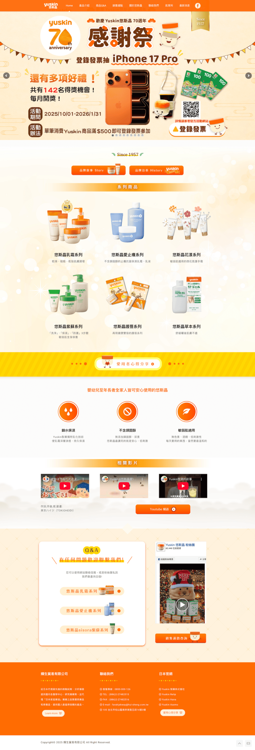 Yuskin Yuskin Home » Works 我們的案例 » Yuskin 首頁 關於我們 單一產品頁 銷售通路 如何使用 最新消息 常見問題 內容型網站 - 網站連結 符合各種裝置的響應式網頁設計(RWD),在桌面、平板、手機上皆提供流暢體驗直覺易用的後台管理系統,搭配 Elementor 客製化元件,後台可自行上傳資料,並透過 Elementor 編輯器輕鬆管理內容完全客製化的會員系統,根據業務需求量身打造SEO 友好架構,提升搜尋引擎能見度與排名大流量主機規劃,包含定時自動備份,以及量身訂做的最經濟高效主機方案